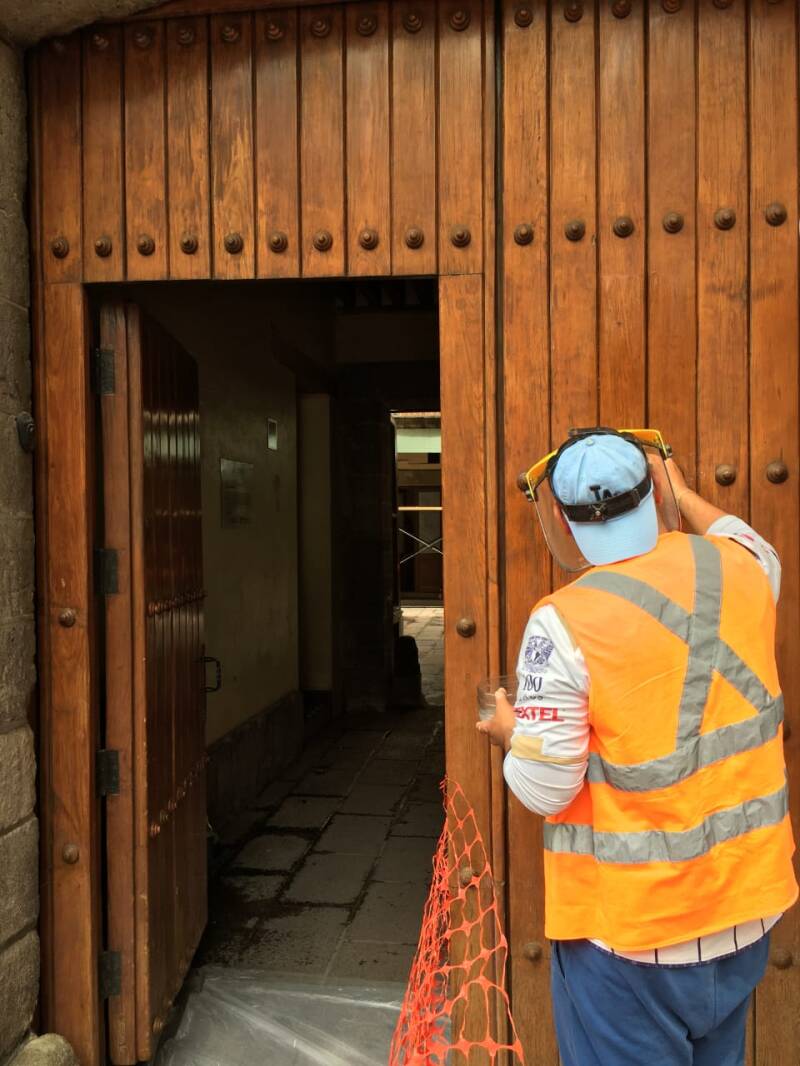 Se ejecutaron trabajos de fumigación preventiva y correctiva en marcos y puertas de madera mediante soluciones especializadas contra agentes biológicos. Asimismo, se realizaron ajustes estructurales, integración de refuerzos, reintegración de faltantes con injertos de madera compatible, limpieza y engrasado de herrajes, así como la aplicación de retardante al fuego e hidratación final de la madera.